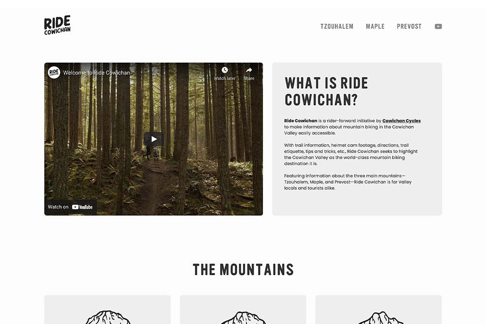 A fully custom built database for mountain bikers in the Cowichan Valley. Ride Cowichan makes it easy for riders to access trail information, ratings, directions, tips, and footage.